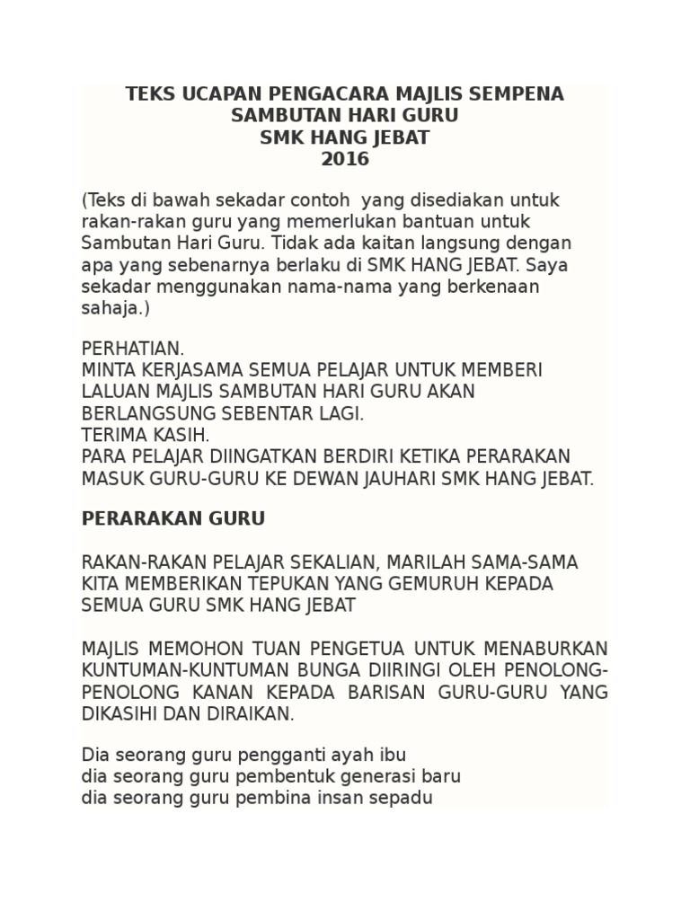 Sehingga semakin sibuk pula Tsalabah mengurusnya. English Good morning our teacher. TEKS UCAPAN PENGACARA MAJLIS SAMBUTAN HARI GURU DAN PEKERJA SK BANGSAR 25 MEI 2014 Kata-kata aluan.